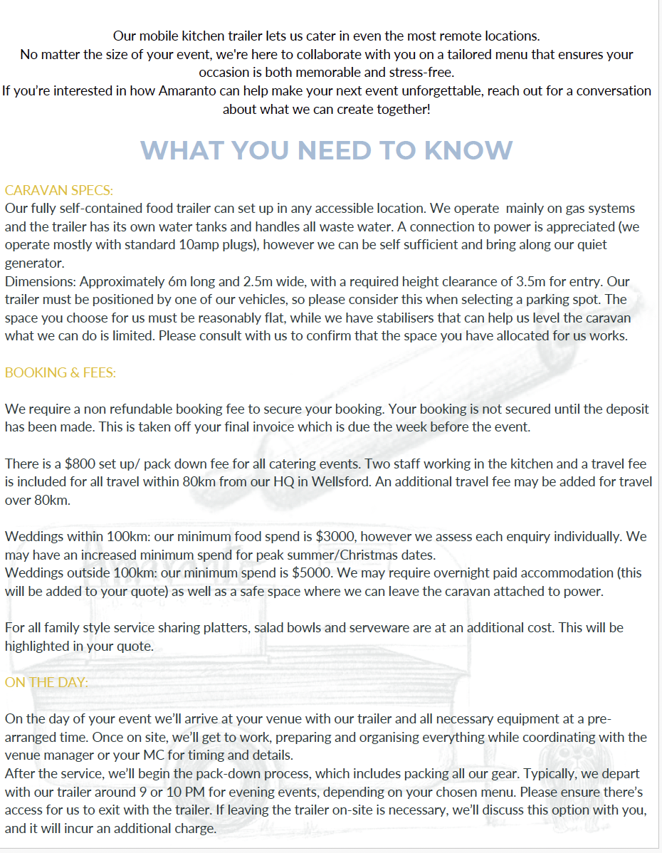 At Songbird Retreat, you have the flexibility to tailor your wedding catering to your unique preferences. The venue offers a BYO (Bring Your Own) policy for both catering and beverages, allowing significant savings and personalised menu selections. To assist in this process, we provide a curated list of trusted caterers, ranging from fine dining services to food trucks and buffet-style meals, ensuring a variety of options to suit different tastes and budgets.