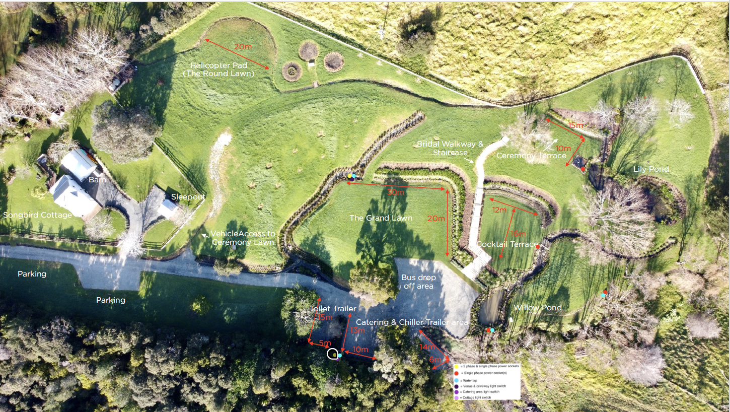 Please find the zones in which people will be found at the time of helicopter arrival in the second plan in this link: http://www.songbirdretreat.co.nz/songbird-site-plan-information-1 (see also below). Guests will be in the following Zones: Cottage precinct, within the fenced area, Ceremony Zone, Post Ceremony Zone and Reception Zone. No persons, unless authorised by the helicopter pilot will be in any other zone.