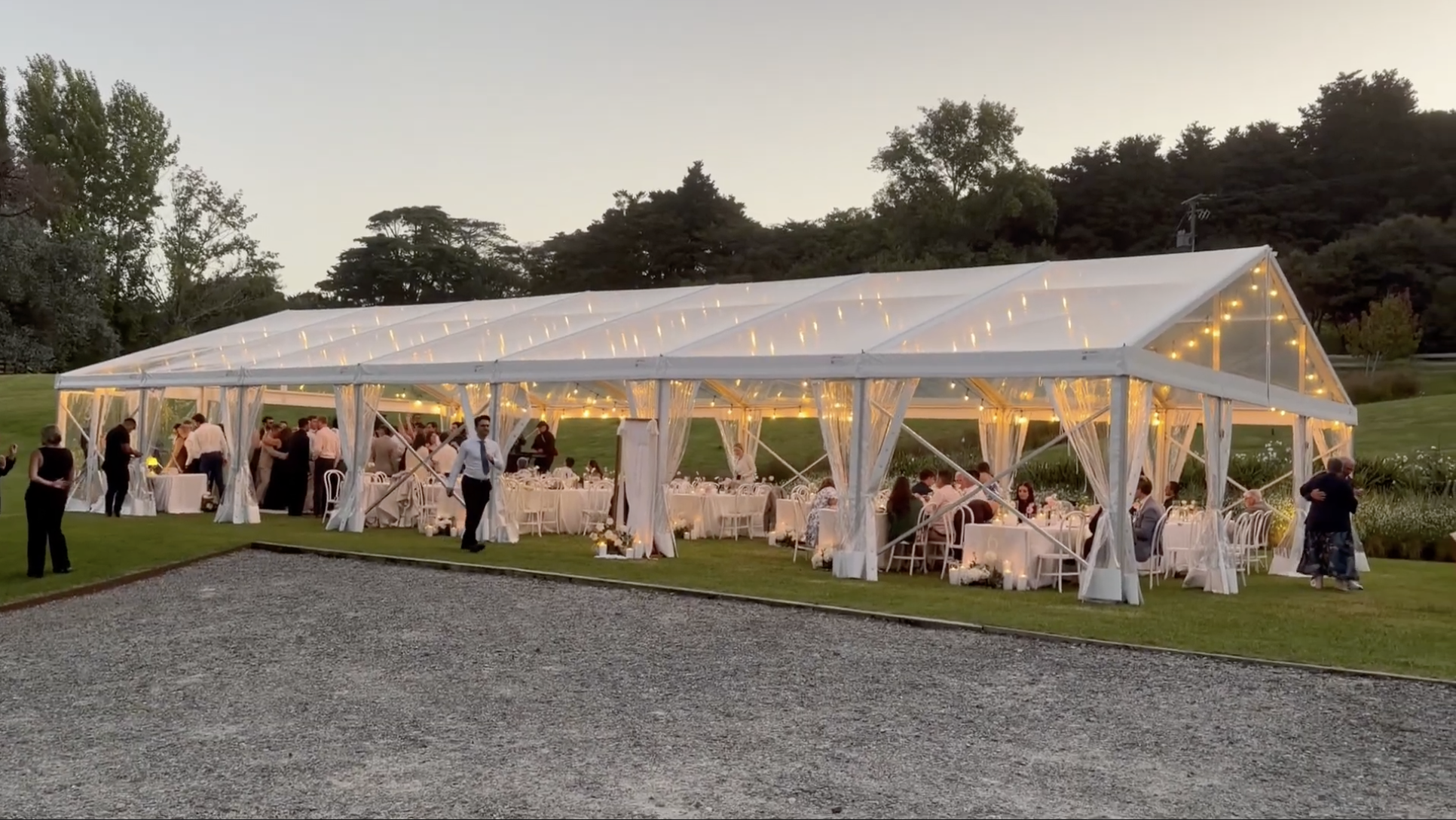 Host your wedding dinner under our clear-roof marquee, where guests can enjoy the beauty of Songbird Retreat’s gardens while staying warm and comfortable. The transparent design ensures your celebration feels connected to the outdoors, day or night.